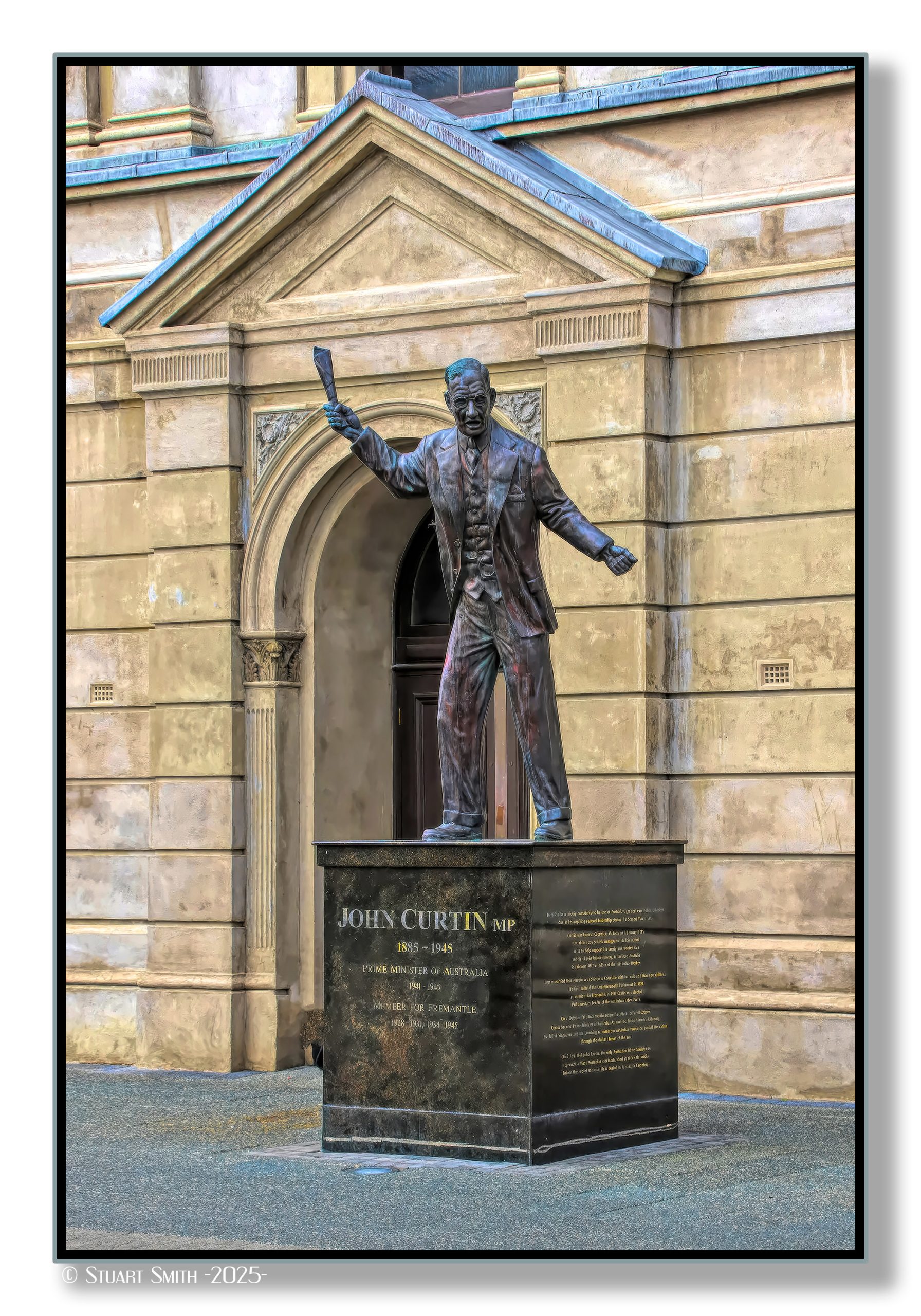 Perhaps the most iconic of Australia’s prime ministers, John Curtin is bound to ordinary Australians by his working class roots and trade union advocacy, but most importantly as Australia’s war-time voice. Although Victorian by birth, Curtin made Western Australia his home in 1917 where he became an editor for a union press. He joined federal parliament in 1928 as the elected Member of Fremantle. He became leader of the Labor Party in 1935 and prime minister in 1941 in the midst of war with Germany and Italy, with troops deployed in fronts in the middle-east and Europe. Weeks after his succession Australia was pulled into a war in the Pacific. Curtin’s decisions strengthened relations with the United States, as their interests were directly threatened by Japan who had attacked ports in Australian and allied ports around the pacific. Curtin died in office only weeks before the formal ending of the war in the Pacific. As Western Australia’s first and only prime minister, John Curtin is commemorated at King’s Square in Fremantle.